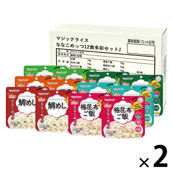 | 商品の特徴 | 7年保存のマジックライスななこめっつが6種類2袋ずつ、計12袋入ったセットです。熱湯の場合7分、水(20℃)の場合40分で調理でき、注水量を変えることによって、ごはんと雑炊等の2通りの食べ方が選べます。原材料にはアレルギー物質(特定原材料及びそれに準ずるもの)を使用していません。包材はバリア性の高いアルミラミネートフィルムを使用し、一部に環境配慮型素材を使用しています。安定性のある袋がそのまま容器になり、スプーン付きで、どこでもお召し上がりいただけます。 | ||