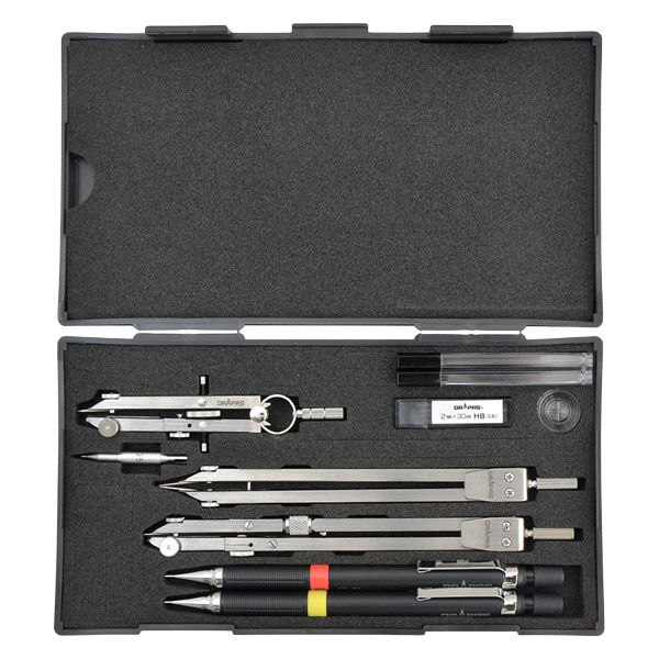 - スライド大コンパス(差替式)、デバイダー大、中型スプリングコンパス(差替式)、0.5mmコンパスシャープ(穂先小)、0.3mmシャープペンシル(替芯付)、0.5mmシャープペンシル(替芯付)、中心器、コンパス芯、半円分度器12cm、ステンレス字消板(A)、ふき布。 ケース名称:D小