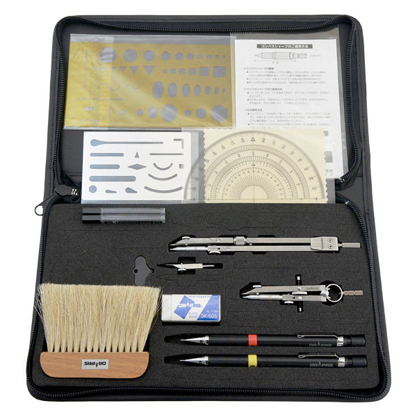 - スライド式大コンパス0.5mm付、スライド式大コンパス用針先部、スプリングコンパス0.3mm付、シャープペンシル0.3・0.5mm各1、シャープ芯0.3・0.5mm(HB)各1、ミニブラシ、消しゴムSK-60S、 スクールテンプレート、ステンレス字消板A、半円分度器12cm、ドライバー、中心器、ふき布