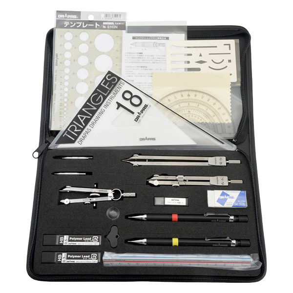 - スライド式中コンパス鉛筆、スプリングコンパス鉛筆、デバイダー大、コンパスシャープ0.3・0.5mm各1、シャープペンシル0.3・0.5mm各1、シャープ芯0.3・0.5mm(HB)各1、三角定規2mm18cm目盛なし、三角スケール15cm、テンプレートE103N、消しゴムSK-60S、ステンレス字消板A、半円分度器12cm、コンパス芯(HB)、ドライバー、中心器、ふき布