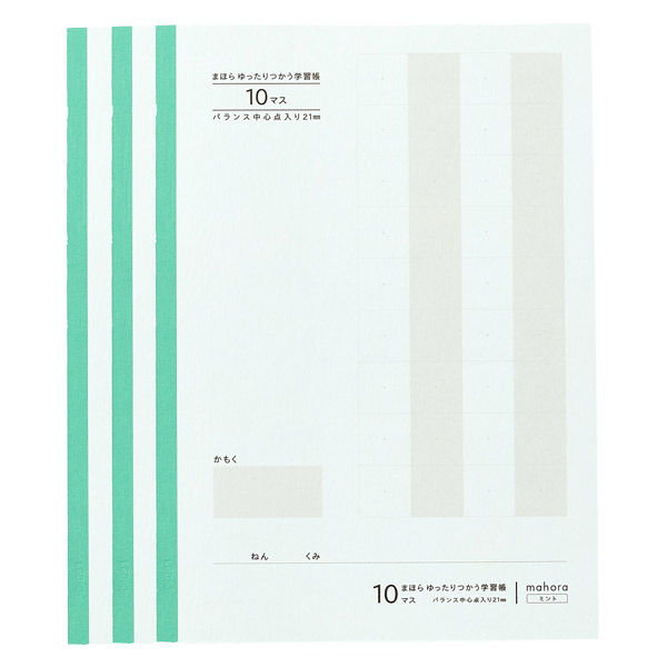 | 商品の特徴 | 生産:日本製、サイズ:セミB5、枚数:30枚(60ページ)×3冊セット 罫線サイズ:10マス(バランス中心点入り21mm)、標準対象学年:小学生1・2年生、こくご10マスで使用できます、色:ミント 中紙には、白い紙に比べ光の反射を抑えられる、色付きの国産色上質紙を使用しています。 マスの中心を示すバランス中心点を基準にして、左右上下の余白を意識して書くことで、罫線に意識を取られることなく、文字を書くことができます。 あみかけの行が1行おきにあるので、書いているところを見失わずまっすぐ書くことができます。 | ||
