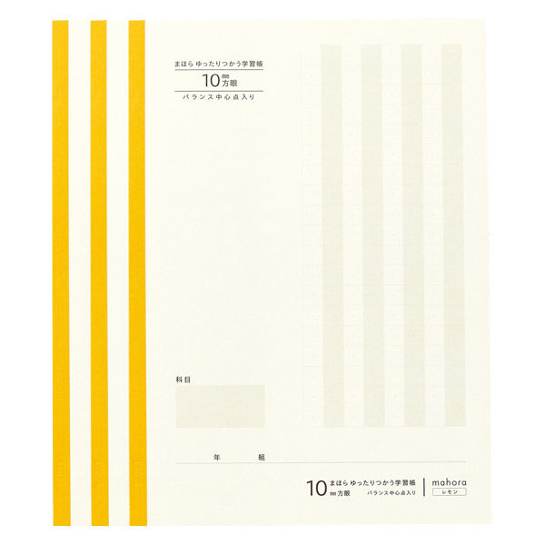 | 商品の特徴 | 生産:日本製、サイズ:セミB5、枚数:30枚(60ページ)×各1冊の3色セット 罫線サイズ:10mm方眼(バランス中心点入り)、標準対象学年:小学生4・5・6年、5mm方眼罫の代わりに使えます、カラー:レモン 中紙には光の反射を抑えられる、色付きの国産色上質紙を使用しています。 マスの中心を示すバランス中心点を基準にして、左右上下の余白を意識して書くことで、罫線に意識を取られることなく、文字を書くことができます。 あみかけの行が1行おきにあるので、書いているところを見失わずまっすぐ書くことができます。 | ||