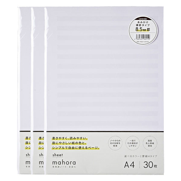 | 商品の特徴 | 生産:日本製、サイズ:A4(W:210×H:297mm)、枚数:30枚(60ページ)×3冊セット 罫線の種類:あみかけ横罫、罫線の間隔:8.5mm、カラー:ラベンダーが3冊セット 目の負担を軽減する国産色上質紙を使用したシートタイプのmahora パンチ穴ガイド付きだから、ファイリングするのもとっても簡単。必要に応じて、ページを追加したり並べ替えたりするのに便利です。 用紙には、あみかけが帯で入っているので書いている行がはっきりと識別できます。 | ||