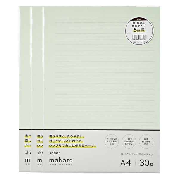 | 商品の特徴 | 生産:日本製、サイズ:A4(W:210×H:297mm)、枚数:30枚(60ページ)×3冊セット 罫線:太・細交互横罫(罫幅 5mm)、カラー:ミントが3冊セット< 目の負担を軽減する国産色上質紙を使用したシートタイプのmahora パンチ穴ガイド付きだから、ファイリングするのもとっても簡単。必要に応じて、ページを追加したり並べ替えたりするのに便利です。 用紙には、太い線と細い線が5mm間隔で交互に入っているので、行の識別がしやすくなっています。 | ||