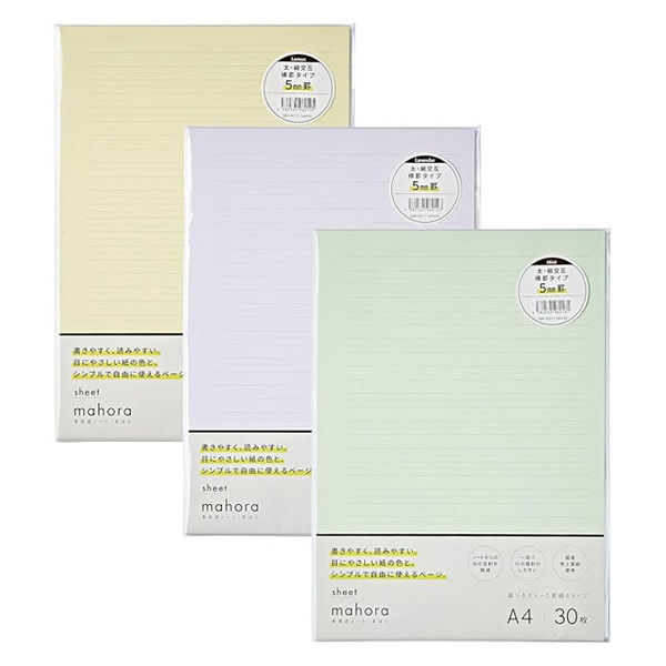 | 商品の特徴 | 生産:日本製、サイズ:A4(W:210×H:297mm)、枚数:30枚(60ページ)×3冊セット 罫線:太・細交互横罫(罫幅 5mm)、カラー:レモン・ラベンダー・ミントが各1冊の3色セット 目の負担を軽減する国産色上質紙を使用したシートタイプのmahora パンチ穴ガイド付きだから、ファイリングするのもとっても簡単。必要に応じて、ページを追加したり並べ替えたりするのに便利です。 用紙には、太い線と細い線が5mm間隔で交互に入っているので、行の識別がしやすくなっています。 | ||