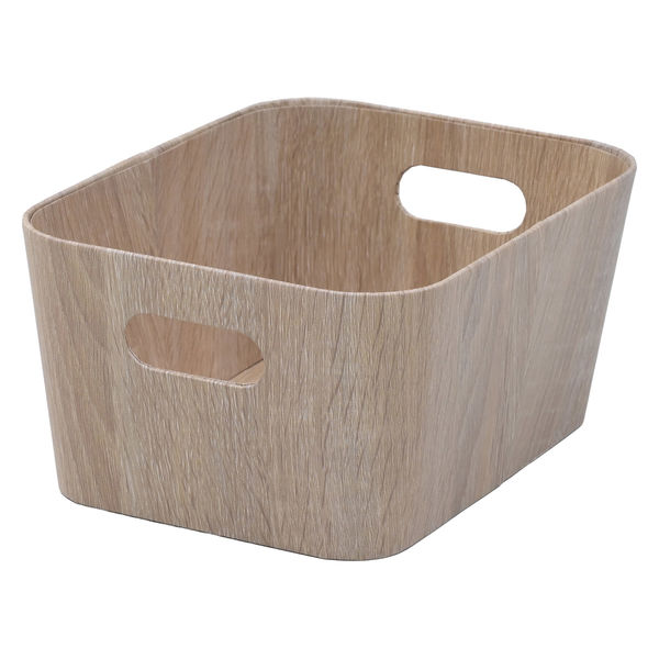 | 商品の特徴 | 木目調のペーパーボックス。紙でできているので軽量で扱いやすい。収納はもちろん、ラックに置けば引き出しのようにも使える。2箇所に取っ手付きで、棚に置いても引き出しやすく、持ち運びもしやすい。ケーブルなどの小物類の整理にぴったり。 | ||