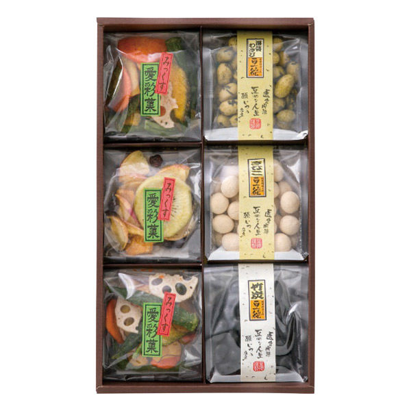 - 特別な日の贈り物としておすすめしたい「六つの彩」豆徳のこだわりが詰まった3種類の豆菓子と野菜・果物チップスを、彩り豊かに詰め合わせました。「選ぶ楽しさと、感謝の心を豆徳のお菓子に込めて」。そんな想いを形にしたギフトセットです。見た目も華やかで、多くのシーンで活躍します。〇「六つの彩」の魅力は、ひとつひとつが職人による丁寧な手作りにあります。見た目の美しさだけでなく、豆菓子の鮮度と風味を最高の状態でお届けします。職人の技術力で製造した、最高の状態でお届け贈り物として選ばれることの多い「六つの彩」だからこそ、感動を大切にして細部までこだわりました。