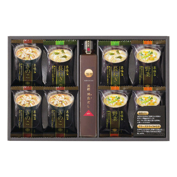 | 商品の特徴 | お湯を注ぐだけで本格的な味わいのフリーズドライ味噌汁と、使いやすい液体タイプの飛魚だしの詰合せです。 | ||