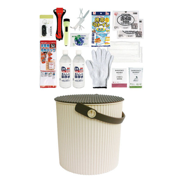 | 商品の特徴 | 乗車中の「もしも」のときに備えておく座れるバケツに入った防災セット。災害や渋滞時に役立つ防災グッズ17点を厳選してセット。防災バケツは収納・バケツとしてだけでなく座ったりテーブルにもなります。 | ||