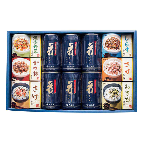 商品仕様 味付のり(10切32枚)6個・ふりかけ(緑黄野菜・かつお・さけ・しらす各2.5g×10袋1箱)・茶漬(さけ6.4g×6袋・わさび5.6g×6袋各1箱) 包装 包装あり