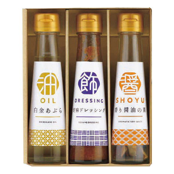 | 商品仕様 | 白金あぶら90g・胡麻ドレッシング100ml・香り醤油の素4.5g各1瓶 | 包装 | 包装あり |