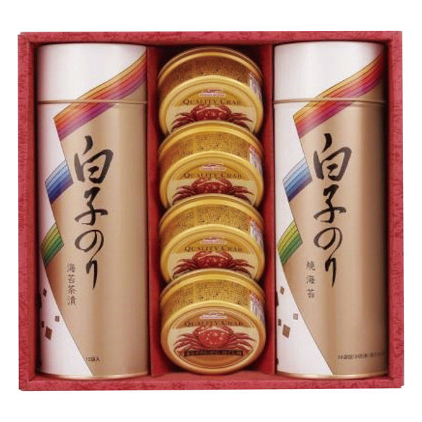 | 商品仕様 | のり茶漬け(12袋)・焼のり(8切5枚14袋)各1缶・まるずわいがにほぐし肉55g×4缶 | 包装 | 包装あり |