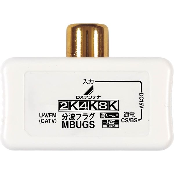 | 商品の特徴 | 新4K8K衛星放送に対応した分波器です。テレビの電波を地デジ(UHF)とCS・BSに分けます。入力側はストレートプラグ式、壁面TV端子に直接差し込みます。出力側はF形コネクタ式、テレビやレコーダーへの接続は別売の同軸ケーブルを使用します。プラグ、コネクタは金メッキ採用。入力プラグとCS/BS出力プラグ端子間は通電形(通電容量DC15V、0.8A)です。本体内部にダイカストケースを採用した高シールド構造です。JEITAHSマーク(ハイシールドマーク)認証済。 | ||