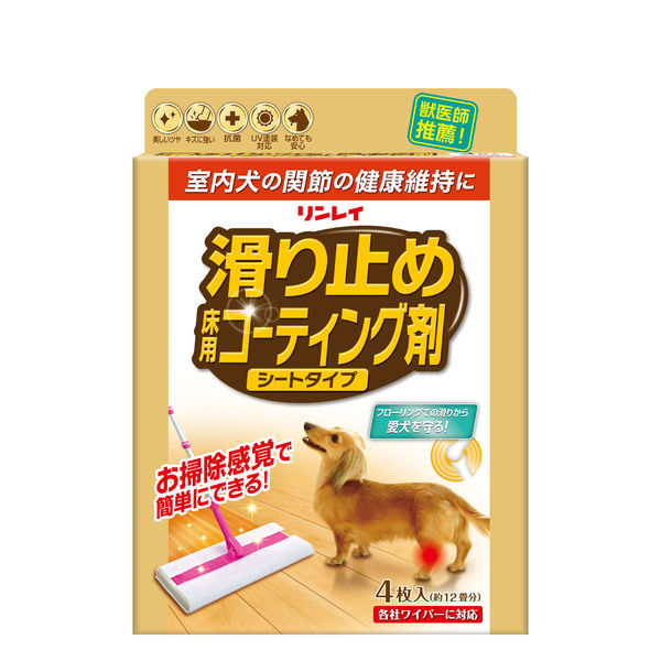 | 商品の特徴 | 初めての方でもお掃除感覚で簡単に塗ることができる「滑り止め床用コーティング剤」のシートタイプ。フローリングでの愛犬の滑りを防ぎ、脱臼や骨折等の関節病を予防。フローリングでの滑りによる骨折等をはじめとした室内事故の発生率が高くなっている現状を受け、ワックスシェアNo.1ブランド「all」を擁するリンレイが、大学病院の獣医師との産学連携に取り組むことで、犬にとっての完成度を追及した。 | ||
