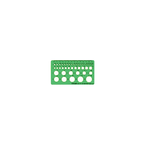 | メーカー品番 | CR-TN105-G | 商品仕様 | ●穴サイズ:径0.6~20mm(41穴)●サイズ:縦83×横150×厚1mm●規格:円定規●材質:耐衝撃性アクリル |