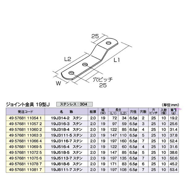 ジョイント金具 19型J 19J818ー6 ステンレス 10個入 DIY・棚 1100100016095 1箱(10個入)(直送品)