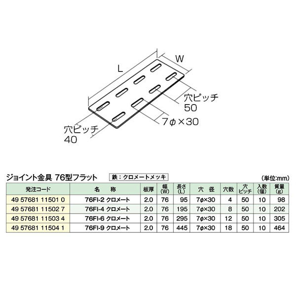 | 寸法 | 長さ(L):295mm 幅(W):76mm 板厚:2.0mm 長穴径:7Φ×30mm 穴ピッチ:50mm | ||