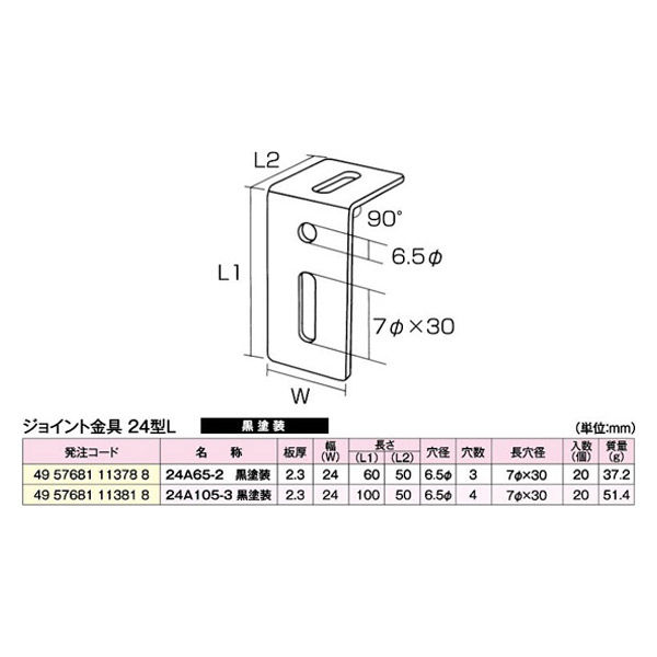 - 長さ(L1):100mm 長さ(L2):50mm 幅:24mm 板厚:2.3mm 穴径:Φ6.5 長穴径:7Φ×30mm