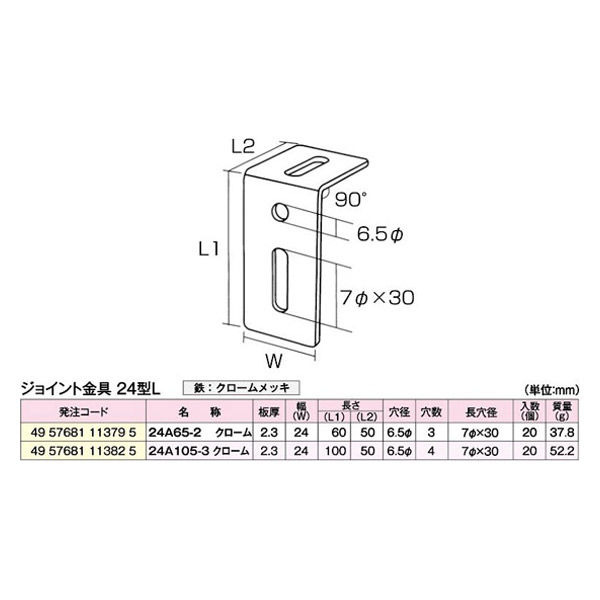 | 寸法 | 長さ(L1):100mm 長さ(L2):50mm 幅:24mm 板厚:2.3mm 穴径:Φ6.5 長穴径:7Φ×30mm | 材質 | 材質:鉄 仕上:クロームメッキ |