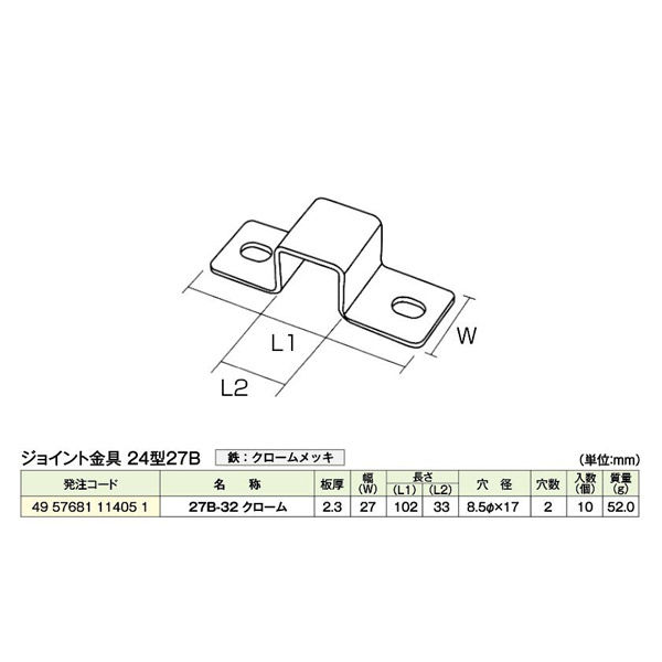 | 寸法 | 長さ(L1):102mm 長さ(L2):33mm 幅:27mm 板厚:2.3mm 穴径:Φ8.5×17mm | ||