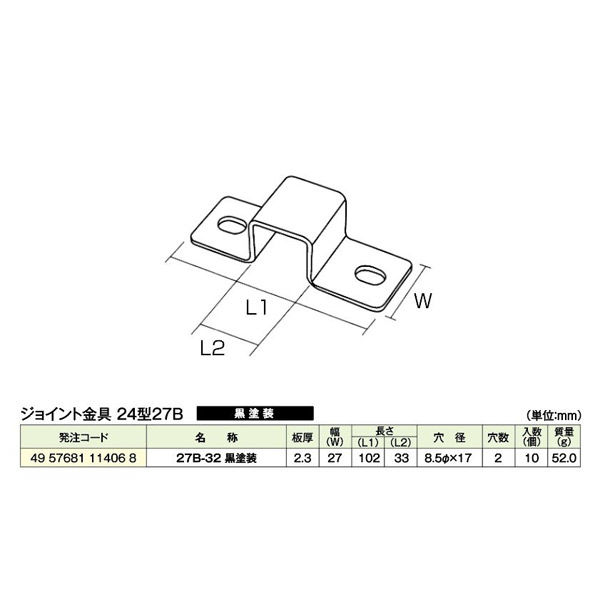 | 寸法 | 長さ(L1):102mm 長さ(L2):33mm 幅:27mm 板厚:2.3mm 穴径:Φ8.5×17mm | カラー | 黒 |