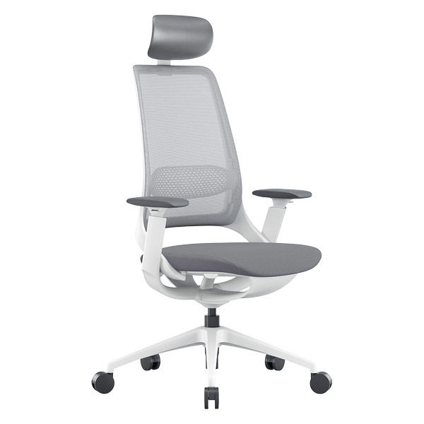 | 材質 | ヘッドレスト:人工皮革・モールドウレタン・ナイロン、背:ポリエステルメッシュ、座:モールドウレタン、張地:布、フレーム:ナイロン、脚部:ガス圧式シリンダー・ナイロン、キャスター:ウレタン | カラー | ライトグレー×ホワイトフレーム |