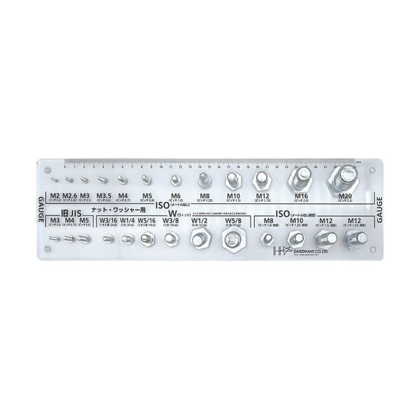 | 商品の特徴 | ●引っ掛けたり、立てかけたりしたい場合は、4隅にある6mmの雌ねじ穴をご使用下さい。●25種類のナット・ワッシャーのサイズ(ピッチ)の測定ができます。 | ||