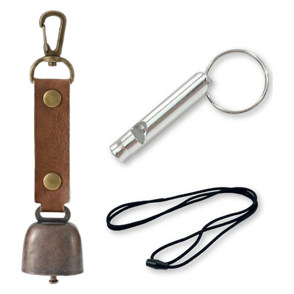 | 商品の特徴 | 【熊よけ鈴】●クマ対策の基本は「出会わないこと」。音を鳴らして存在を知らせる対策は、よく知られた方法のひとつです。山歩きはもちろん、街中での出没に備え、熊鈴は外出時に携帯しておきたいグッズです。●頑丈なステンレス製●消音マグネット付き●カラビナ付き●PUレザーを採用 【アルミホイッスル】 ●危機的状況の周知や助けを求めるとき、大きな音のする笛類は、体力を消費せずに周りに知らせることができます。 | ||