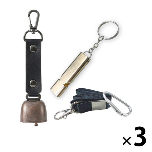 | 商品の特徴 | 【熊よけ鈴】●クマ対策の基本は「出会わないこと」。音を鳴らして存在を知らせる対策は、よく知られた方法のひとつです。山歩きはもちろん、街中での出没に備え、熊鈴は外出時に携帯しておきたいグッズです。●頑丈なステンレス製●消音マグネット付き●カラビナ付き●PUレザーを採用 【アルミホイッスル】 ●危機的状況の周知や助けを求めるとき、大きな音のする笛類は、体力を消費せずに周りに知らせることができます。 | ||