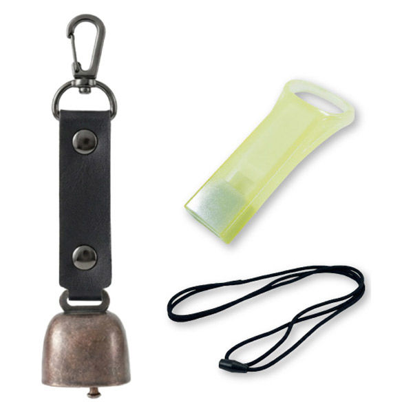 | 商品の特徴 | 【熊よけ鈴】●クマ対策の基本は「出会わないこと」。音を鳴らして存在を知らせる対策は、よく知られた方法のひとつです。山歩きはもちろん、街中での出没に備え、熊鈴は外出時に携帯しておきたいグッズです。●頑丈なステンレス製●消音マグネット付き●カラビナ付き●PUレザーを採用 【蓄光エマージェンシーホイッスル】:蓄光グリーンは光をためて光るタイプ、薄型でかさばりません。危険な状況の周知や助けを求めるとき、大きな音のする笛類は 体力を消費せずに周りに知らせることができます。 | ||