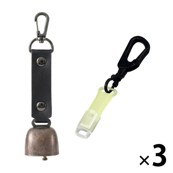 | 商品の特徴 | 【熊よけ鈴】●クマ対策の基本は「出会わないこと」。音を鳴らして存在を知らせる対策は、よく知られた方法のひとつです。山歩きはもちろん、街中での出没に備え、熊鈴は外出時に携帯しておきたいグッズです。●頑丈なステンレス製●消音マグネット付き●カラビナ付き●PUレザーを採用【蓄光エマージェンシーホイッスル】体力を消耗せずに周りに自分の存在を知らせることができます。●スリムで丈夫●人の耳に聞こえやすいとされる3000HZ・95db●暗い場所でも光る蓄光タイプ●キャップ・カラビナリング付き | ||