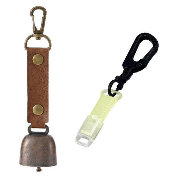 | 商品の特徴 | 【熊よけ鈴】●クマ対策の基本は「出会わないこと」。音を鳴らして存在を知らせる対策は、よく知られた方法のひとつです。山歩きはもちろん、街中での出没に備え、熊鈴は外出時に携帯しておきたいグッズです。●頑丈なステンレス製●消音マグネット付き●カラビナ付き●PUレザーを採用【蓄光エマージェンシーホイッスル】体力を消耗せずに周りに自分の存在を知らせることができます。●スリムで丈夫●人の耳に聞こえやすいとされる3000HZ・95db●暗い場所でも光る蓄光タイプ●キャップ・カラビナリング付き | ||