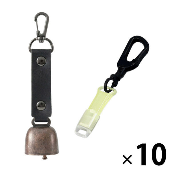 | 商品の特徴 | 【熊よけ鈴】●クマ対策の基本は「出会わないこと」。音を鳴らして存在を知らせる対策は、よく知られた方法のひとつです。山歩きはもちろん、街中での出没に備え、熊鈴は外出時に携帯しておきたいグッズです。●頑丈なステンレス製●消音マグネット付き●カラビナ付き●PUレザーを採用【蓄光エマージェンシーホイッスル】体力を消耗せずに周りに自分の存在を知らせることができます。●スリムで丈夫●人の耳に聞こえやすいとされる3000HZ・95db●暗い場所でも光る蓄光タイプ●キャップ・カラビナリング付き | ||