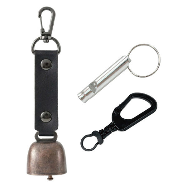 | 商品の特徴 | 【熊よけ鈴】●クマ対策の基本は「出会わないこと」。音を鳴らして存在を知らせる対策は、よく知られた方法のひとつです。山歩きはもちろん、街中での出没に備え、熊鈴は外出時に携帯しておきたいグッズです。●頑丈なステンレス製●消音マグネット付き●カラビナ付き●PUレザーを採用【ホイッスル】体力を消耗せずに周りに自分の存在を知らせることができます。●スリムで丈夫●カラビナリング付き | ||