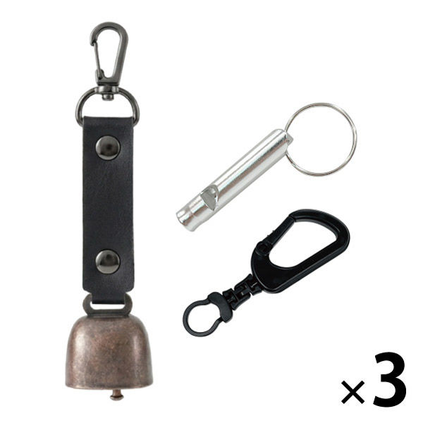 | 商品の特徴 | 【熊よけ鈴】●クマ対策の基本は「出会わないこと」。音を鳴らして存在を知らせる対策は、よく知られた方法のひとつです。山歩きはもちろん、街中での出没に備え、熊鈴は外出時に携帯しておきたいグッズです。●頑丈なステンレス製●消音マグネット付き●カラビナ付き●PUレザーを採用【ホイッスル】体力を消耗せずに周りに自分の存在を知らせることができます。●スリムで丈夫●カラビナリング付き | ||