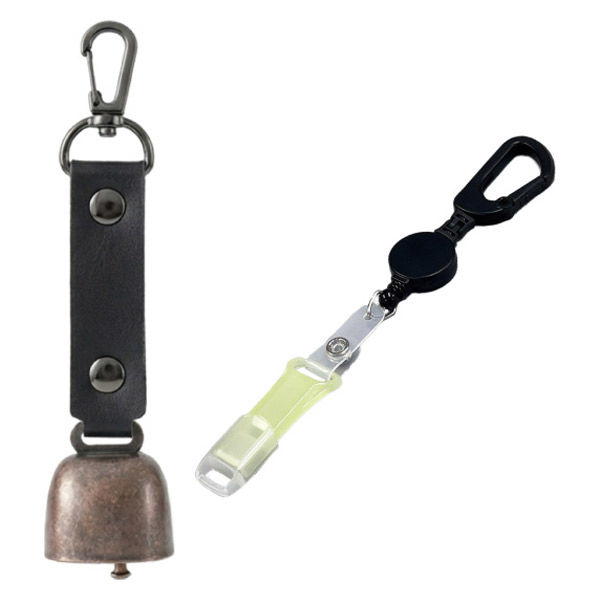| 商品の特徴 | 【熊よけ鈴】●クマ対策の基本は「出会わないこと」。音を鳴らして存在を知らせる対策は、よく知られた方法のひとつです。山歩きはもちろん、街中での出没に備え、熊鈴は外出時に携帯しておきたいグッズです。●頑丈なステンレス製●消音マグネット付き●カラビナ付き●PUレザーを採用 【蓄光エマージェンシーホイッスル】:蓄光グリーンは光をためて光るタイプ、薄型でかさばりません。危険な状況の周知や助けを求めるとき、大きな音のする笛類は 体力を消費せずに周りに知らせることができます。 | ||