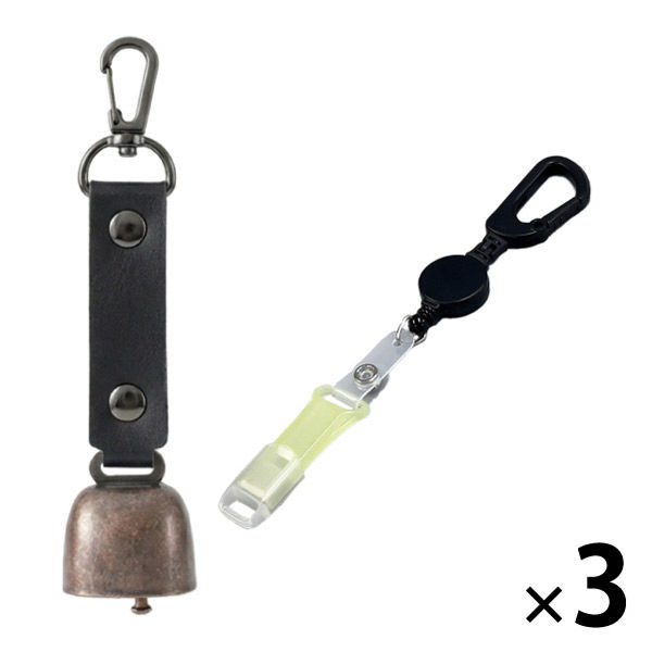 | 商品の特徴 | 【熊よけ鈴】●クマ対策の基本は「出会わないこと」。音を鳴らして存在を知らせる対策は、よく知られた方法のひとつです。山歩きはもちろん、街中での出没に備え、熊鈴は外出時に携帯しておきたいグッズです。●頑丈なステンレス製●消音マグネット付き●カラビナ付き●PUレザーを採用 【蓄光エマージェンシーホイッスル】:蓄光グリーンは光をためて光るタイプ、薄型でかさばりません。危険な状況の周知や助けを求めるとき、大きな音のする笛類は 体力を消費せずに周りに知らせることができます。 | ||