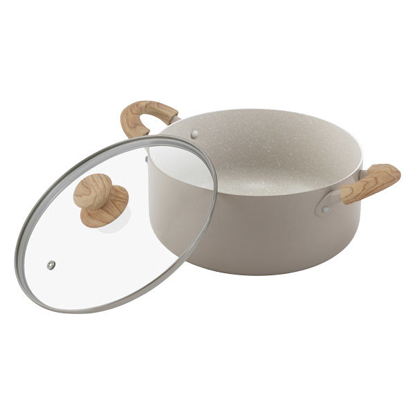 | 商品の特徴 | 注ぎ口が2か所付いているため、液体などを注ぎやすい形状となっています。ナチュラルカラーと木目調のハンドル・ガラスふたのつまみは、キッチンに馴染みやすく可愛らしいデザインです。内側はマーブル模様です。有害物質(PFOA/PFOS)不使用の塗料を使用しているため、安心してお使いいただけます。 | ||