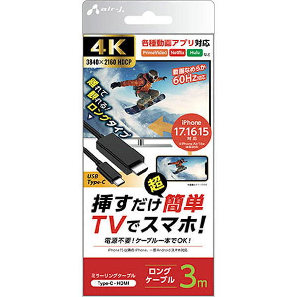 エアージェイ ミラーリングケーブル Type-C to HDMI 4K/60Hz 3m AHD-C3M 1本(直送品)