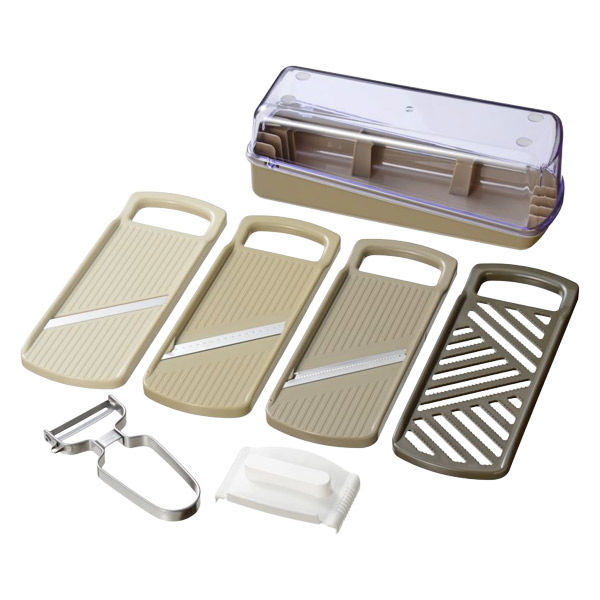 | セット内容 | スライサー・千切り・つま切り・おろし・ステンレスピーラー・収納ケース・容器フタ・安全ホルダー×各1 | ||
