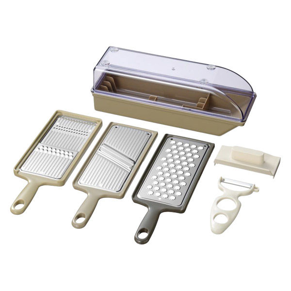 | セット内容 | スライサー・千切り/つま切り・おろし・三徳ピーラー・収納ケース・容器フタ・安全ホルダー×各1 | ||