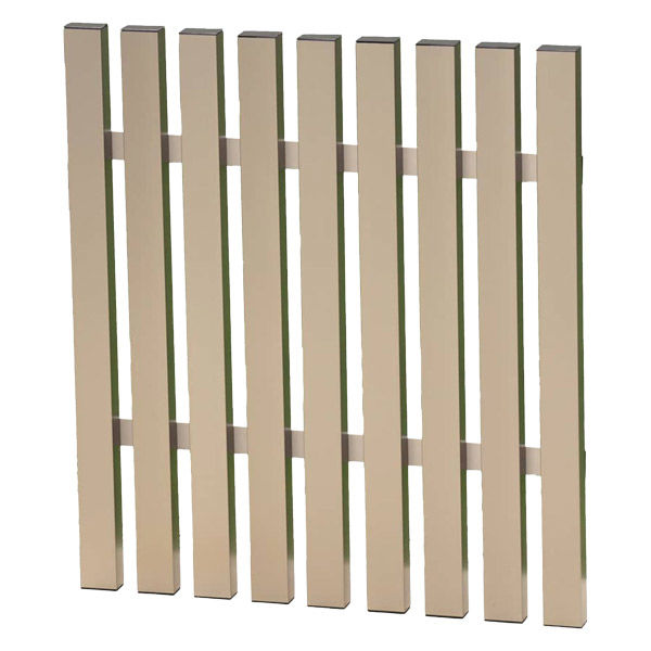 | 商品の特徴 | 後付けフェンスA01型は、一般的なメッシュフェンスに後付けできるアルミ製パネルです。1本1本が太めの格子デザインで、アクセントパネルとしても使用できます。取り付け・取りはずしはドライバー1本で簡単に行えます。取付金具は横スライドして位置調整できます。 | ||