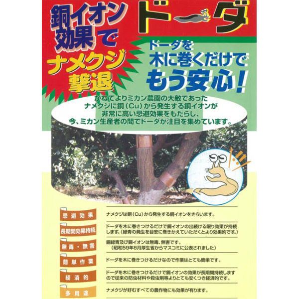 多用途 ナメクジが好むすべての農作物にも効果が有ります。 長期間効果持続 ドーダを木に巻きつけるだけで銅イオンの出続ける限り 効果が持続します。(緑青の発生を目安に巻きかえていた だくとより効果的です。)