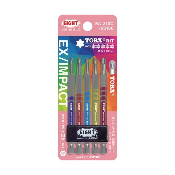 | 商品の特徴 | ●エイト既存品ビットの約3倍の耐久力を誇ります。●削り込み加工が工具からの衝撃を受け止め、ビット本体とネジへのダメージを防ぎます。●鮮やかなカラー仕上げで、サイズを選びやすく作業効率を高めます。●18~40V対応(T10とT15は除く) | ||