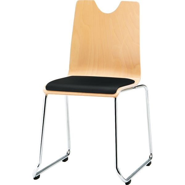 | 商品の特徴 | リフレッシュスペース向けのスタッキングチェア、RMHシリーズ。背もたれにバッグやリュックを掛けられるように凹みをつけた、ループ脚タイプの木製チェアです。表面にブナ材をあしらうことで木目を活かしました。脚はクロームメッキ仕上げのスチールパイプで、座面は抗菌・防汚・耐次亜塩素酸加工のビニールレザー張り。木部カラーは明るい雰囲気のナチュラルです。4脚まで平積み可能。座裏部についているPP樹脂製カバーで、スタッキングしても座面にフレームの跡がつきません。 | ||