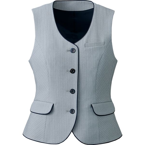 女性らしい曲線で描いたベスト。明るいグレートーンを引き締めて見せます。脇パーツをバイアスにし後にも切り替えベルトの飾りを取り入れています。