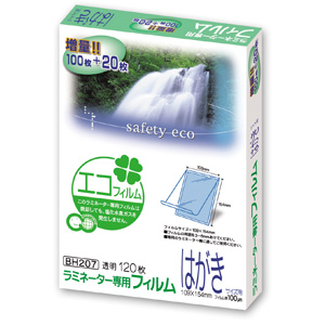 | 商品の特徴 | ラミネートフィルム幅広タイプ。お得用パック120枚入り。静電防止処理品。はがき。100ミクロン。 | ||