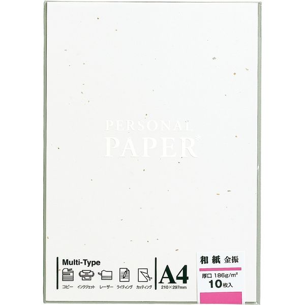 | 商品の特徴 | 金箔と銀箔が抄き込まれた用紙が品のある案内状・招待状・ペーパークラフト・各種表紙に最適なOA用紙です。レーザープリンタ、IJプリンタなどあらゆるプリンタでご利用いただけます。サイズ:210×297mm(A4判)。坪量:186g/平方m、紙厚:約0.25mm。10枚入。 | ||