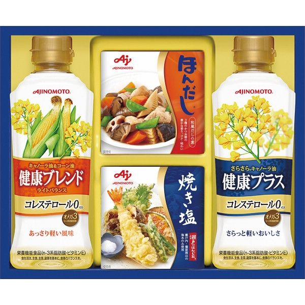 | 商品仕様 | ●ほんだし48g×1、瀬戸のほんじお焼き塩80g×1、AJINOMOTOキャノーラ油&コーン油健康ブレンドライトバランス350g×1、AJINOMOTOさらさらキャノーラ油健康プラス350g×1 | 質量 | 1.1kg |