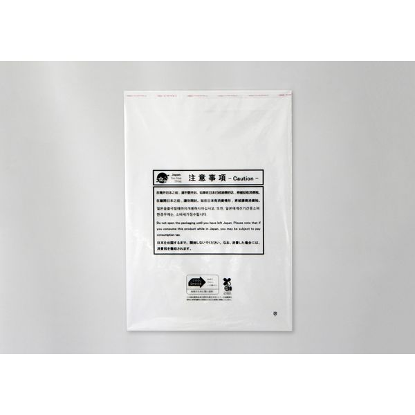 バイオマスプラスチック原料配合環境対応品!免税品に欠かせない指定消耗品専用袋で、封入後テープを剥がすと文字残り、開封・改ざんを防止します。